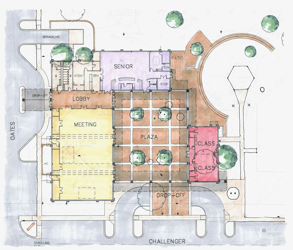 This project included the design of a new 13,000 s.f. multi-use building. The facility also includes a two-classroom pre-school. The concept, wraps the buildings around a shaded plaza that serve as a gateway to the city park.
