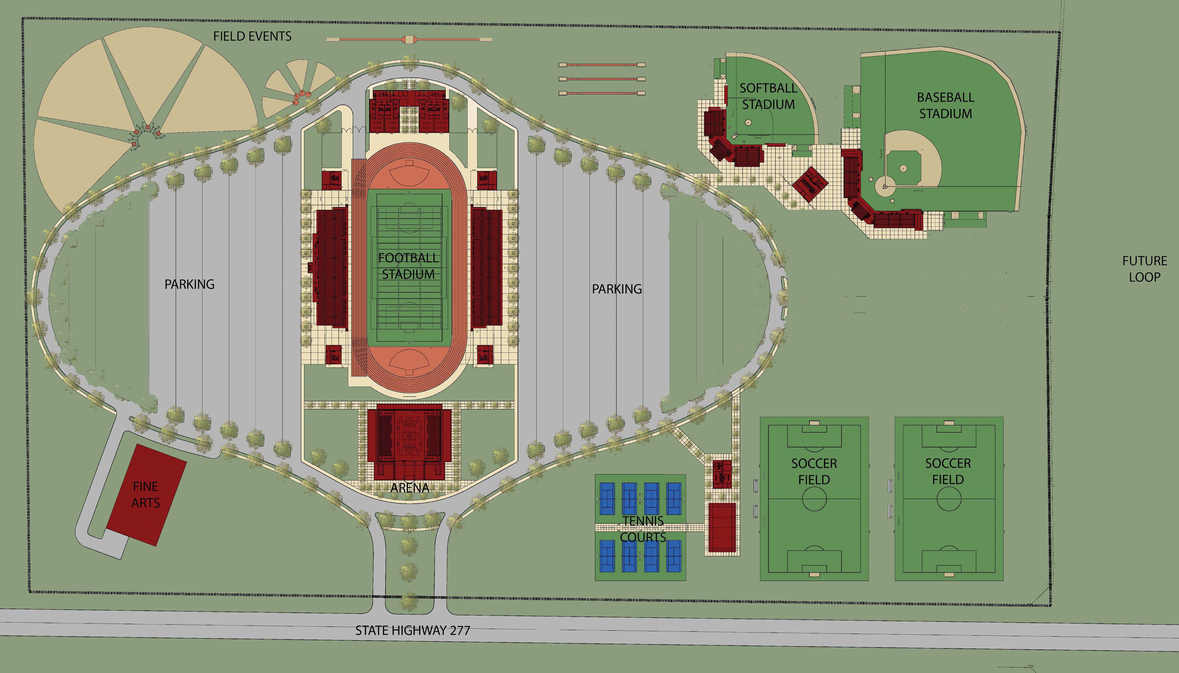 In 2007, the voters of Eagle Pass passed a bond issuance for the construction of a new student activity complex. The complex includes a football stadium, baseball stadium, softball stadium, soccer fields, tennis courts, and a gymnasium. This project was designed in association with Kell Munoz Architects in San Antonio.